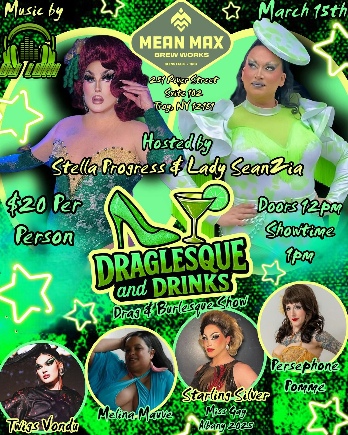 Join us for DRAGLESQUE & DRINK: Burlesque & Drag Show ! This spectacular event at Mean Max Brew Work will leave you wanting more! Get ready for a fabulous mix of drag and burlesque and enjoy amazing beverages in style. Stella Progress and Lady SeanZia host a fabulous cast including, Miss Gay Albany 2025, Starling Silver, local burlesque staples, Persephone Pomme and Melina Mauve and Syracuse icon, Twigs Vondu. Come ready to enjoy a day filled with amazing performances and fabulous beverages. DJ Loki will be on the beats! Don't miss out on this exciting event – it's going to be a wild time!