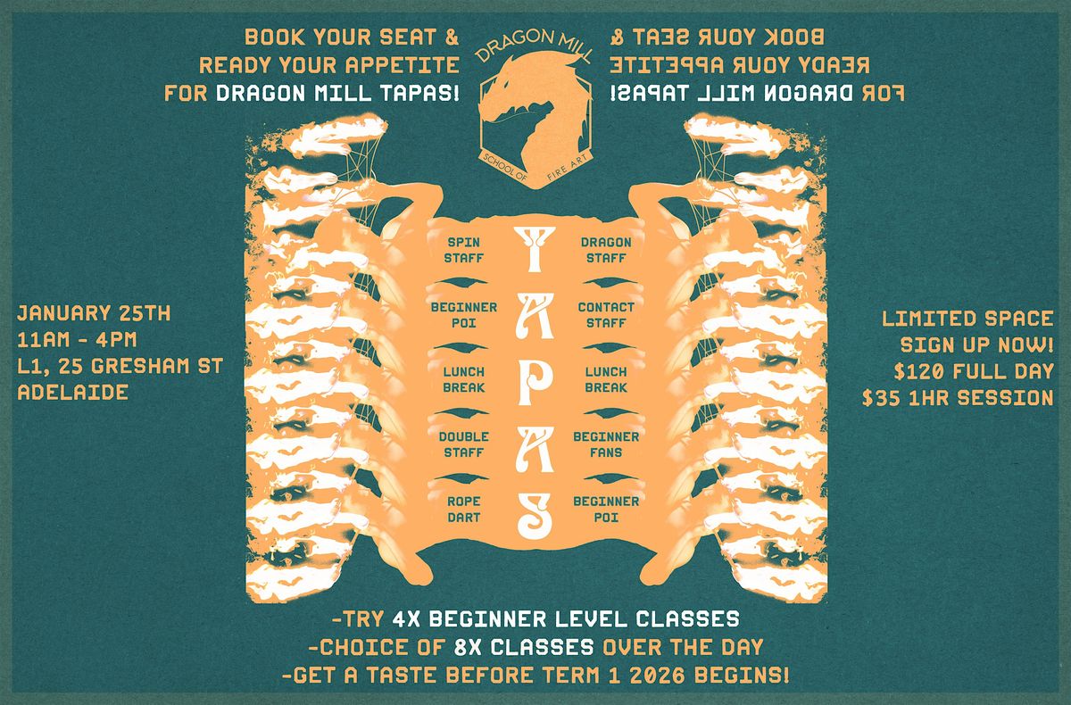 Welcome to Dragon Mill Tapas! Join us at the School of Fire Art for a fun day of beginner fire art classes. Come and try a selection of beginner classes to get a taste of what's on offer at Dragon Mill - School of Fire Art.