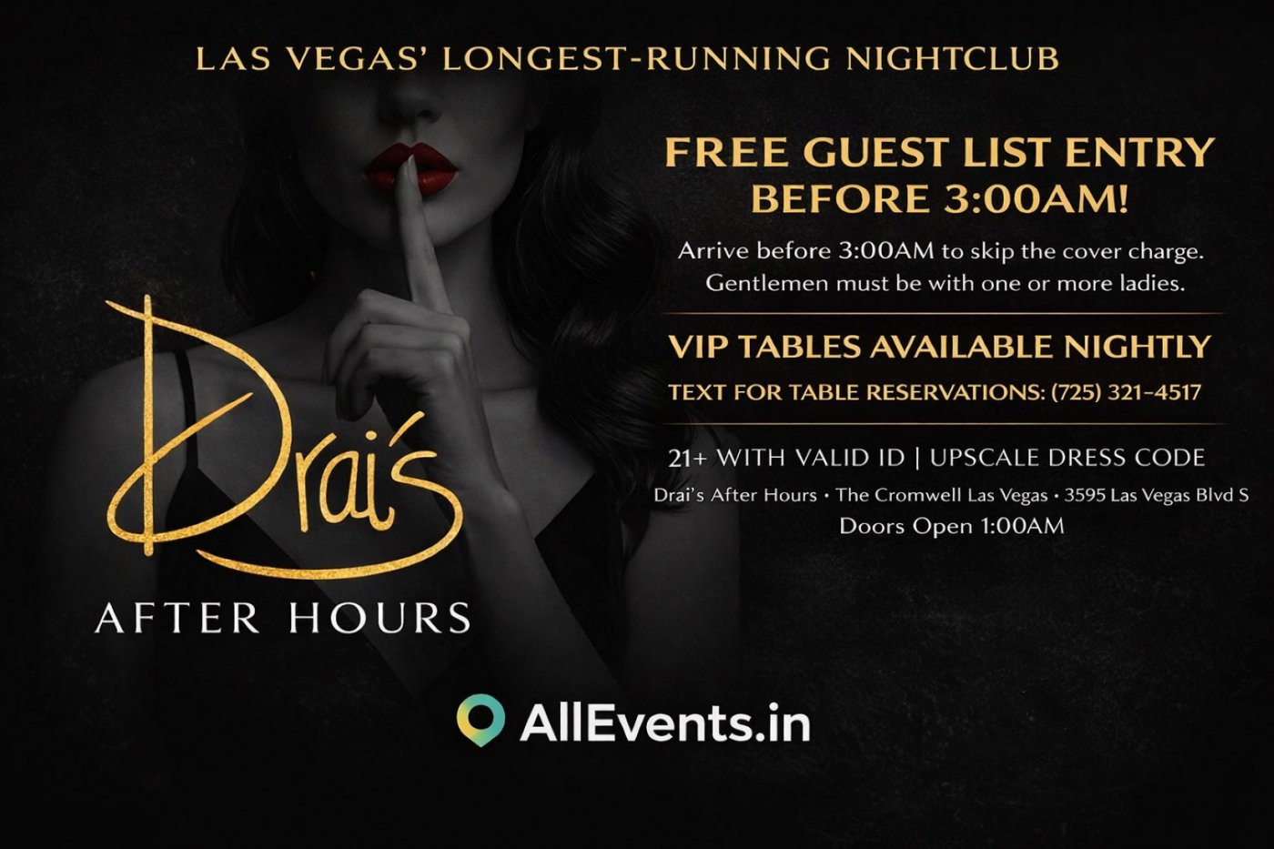 This iconic afterhours nightclub is known for its high-energy atmosphere, elite crowd, and exclusive VIP experience, making it one of the most searched and attended nightlife events in Las Vegas. With multiple rooms, top DJs spinning hip-hop and open-format music, and a reputation for going strong into the early morning, Drais Afterhours sets the standard for Las Vegas after-hours nightlife.