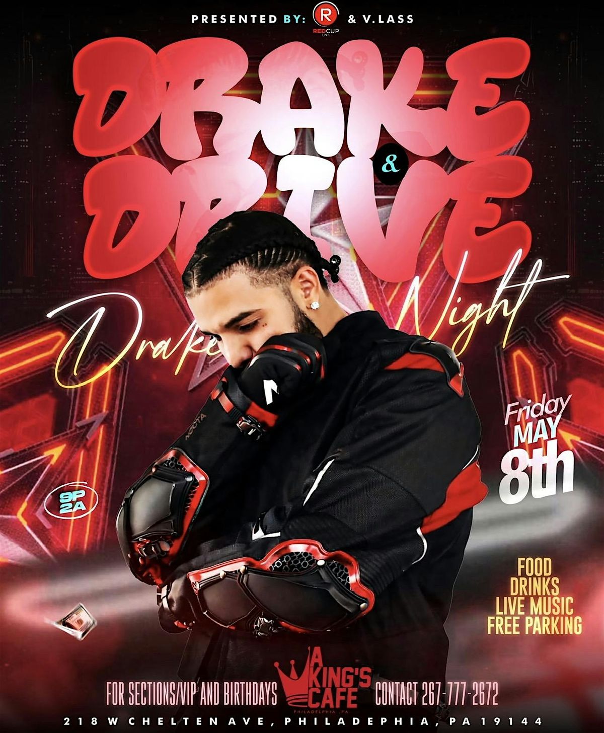 Cruise and vibe with Drake’s hits live—perfect night to drive to Akingscafe, chill, eat drink smoke hookah and feel the beats in person!About this Event