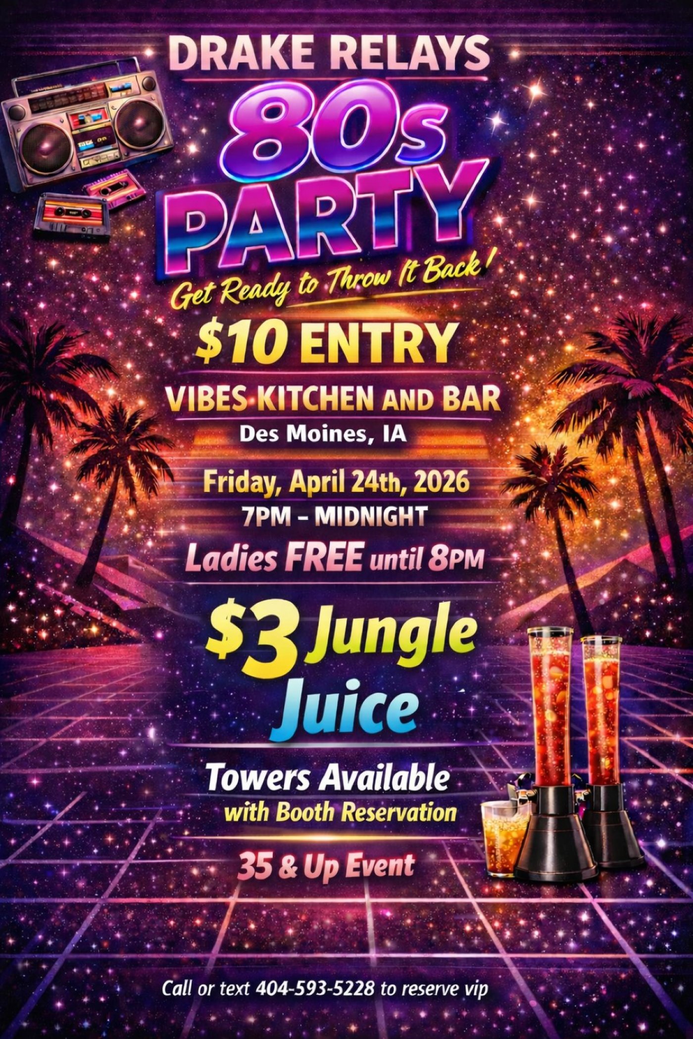 $10 entry, 35 and up event, 80s theme, ONLY 80s music, regular menu and drinks, dress like its the 1980s