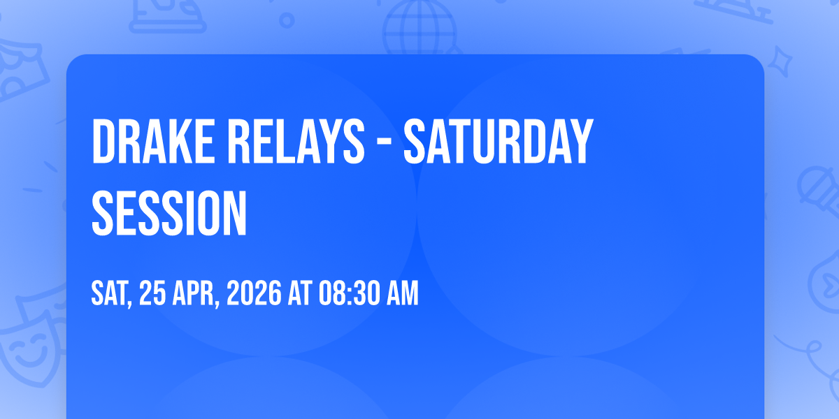 📍 Location: 41.604, -93.6538🌟 Be part of history at Drake Relays - Saturday Session, an extraordinary gathering that will captivate your imagination! 🏛️ The prestigious Drake Stadium in Des Moines, IA sets the stage for an unforgettable experience on April 25th, 2026 at 08:30 AM. ✨ They are bringing together the finest elements of entertainment and innovation to create moments that will take your breath away. From the moment you arrive, you'll be immersed in an atmosphere of wonder and excitement. 🎯 This carefully planned event ensures every guest experiences something truly special. 🎊 Early booking is recommended for this must-attend event of the season!