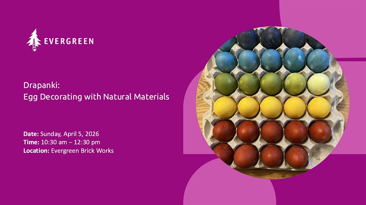 Learn how to dye eggs with natural materials, including fruits and vegetables that you can find in your own kitchen, or at Evergreen's weekly Farmers Market. Folk craft practitioner and Evergreen staff member Olivia Dziwak will demonstrate how to create beautiful colour without chemical dyes, and then how to decorate the eggs in the Polish folk style, called "drapanki" or "skrobanki".