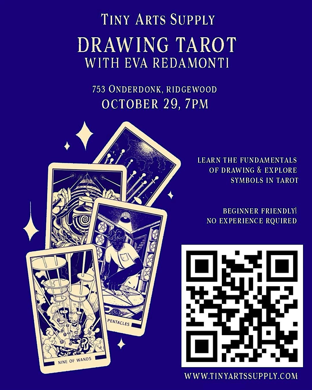 Explore the rich symbolism of tarot and learn how to bring your own artistic interpretations to life. In this guided workshop, artist Eva Redamonti, will take you from concept to completion — from brainstorming and sketching to creating a finished piece in the medium of your choice.