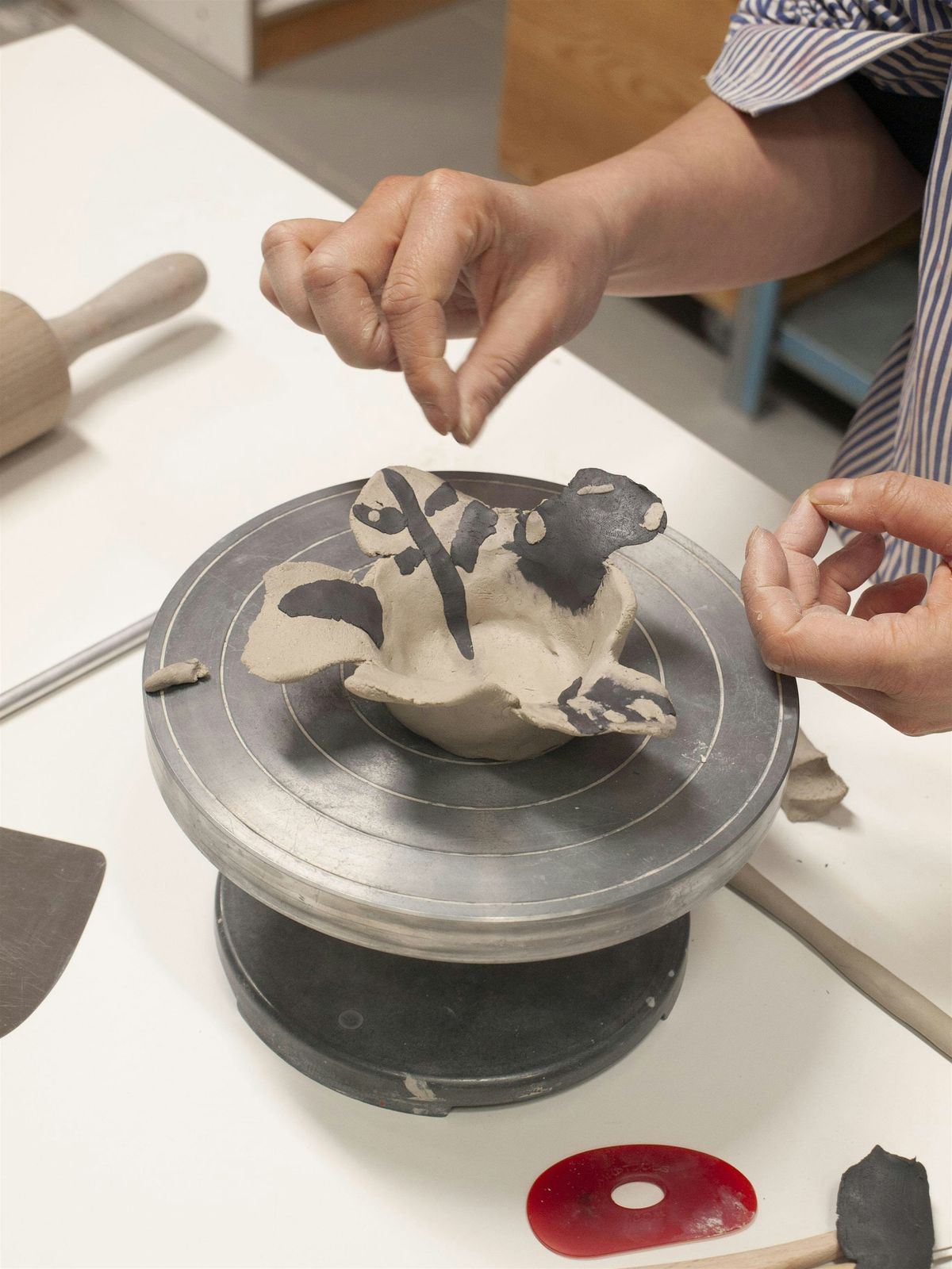 You will be guided through some core hand building techniques which you can mix and match to build your pieces. We will especially focus on surface decoration through line, mark-making or simple illustration, using clays of white and black.