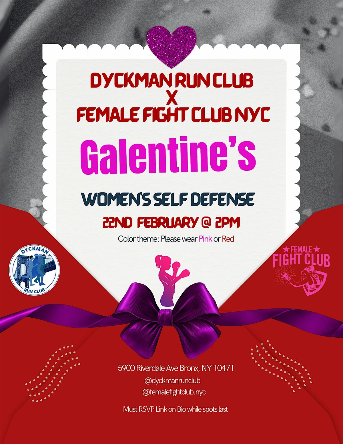 Confidence is the best Valentine you can give at Dyckman Run Club❣️It’s a Galentine’s Day celebrating women empowerment. 💘 We are so excited to announce our 2nd Women’s Self Defense Class! For this second go around, we collaborate with the powerful Gym and women of FFC. 💕
