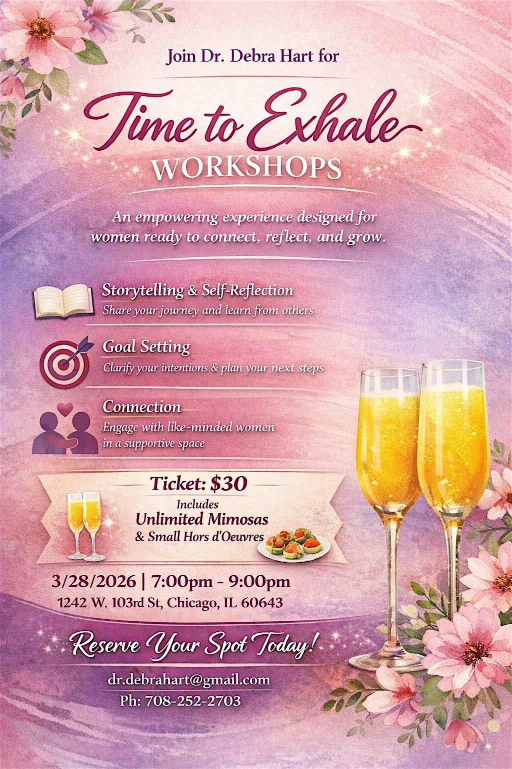Join Dr. Debra Hart for the “Time to Exhale” workshop, an empowering evening designed for women seeking connection, self-reflection, and personal growth. Participants will engage in storytelling, goal setting, and meaningful conversation with like-minded women in a supportive and uplifting environment. For just $30, enjoy unlimited mimosas and small hors d’oeuvres while nurturing your mind, heart, and aspirations. Don’t miss this opportunity to connect, reflect, and leave inspired—reserve your spot today!