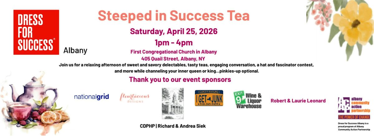 We hope you can join us at our 2nd anual Dress for Success Albany Steeped in Success Tea on Saturday, April 25, 2025 from 1pm-4pm at the First Congregational Church in Albany. This year we will have a hat and fascinator contest, and look forward to seeing all of the beautiful hats or fascinators you wear, if you so choose. A variety of sweet & savory delectables and tasty teas will be served, engaging conversation, raffles, tea bingo, and more!