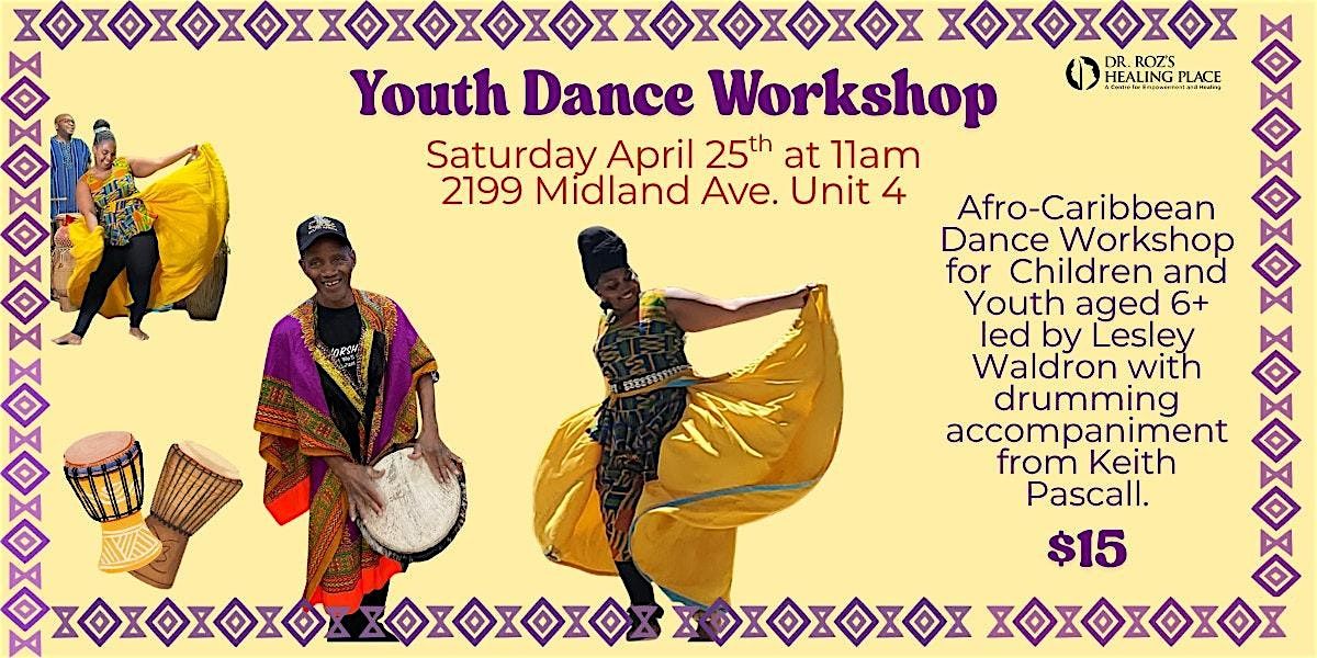 An Afro-Caribbean Dance Workshop for Children and Youth aged 6+, led by Lesley Waldron with live drumming accompaniment from Keith Pascall.