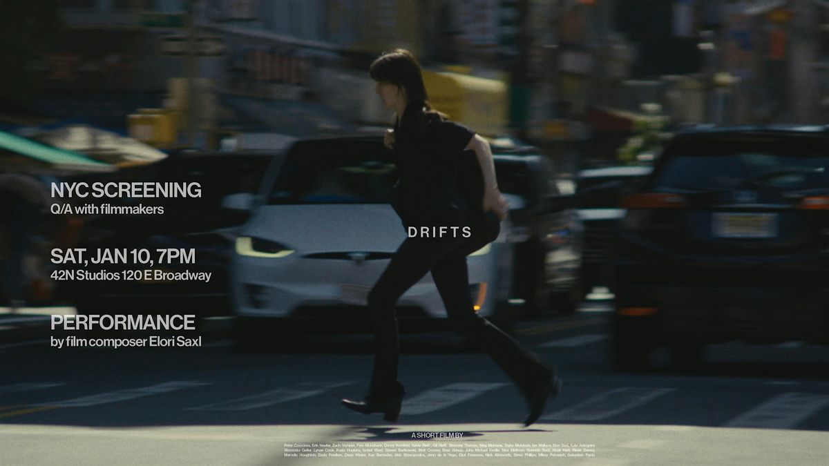 The evening will open with a live performance by the film's composer Elori Saxl that will segue into the premiere of DRIFTS, followed by a Q/A with the filmmakers Peter Coccoma (writer/director), Erin Neufer (lead actor), Taylor McIntosh (DP), and Breanne Thomas (producer) moderated by film programmer Shay Filmore.
