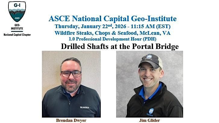 Welcome to Drilled Shafts at the Portal Bridge event! Join us on Thu. Jan. 22, 2026 at 11:15 AM at Wildfire Steaks, Chops & Seafood in Tysons to learn about the drilled shafts installed at the new Portal North Bridge and the challenges faced during the planning and construction of drilled shafts. Don't miss out on this opportunity to network with industry professionals and experts in the field. See you there!