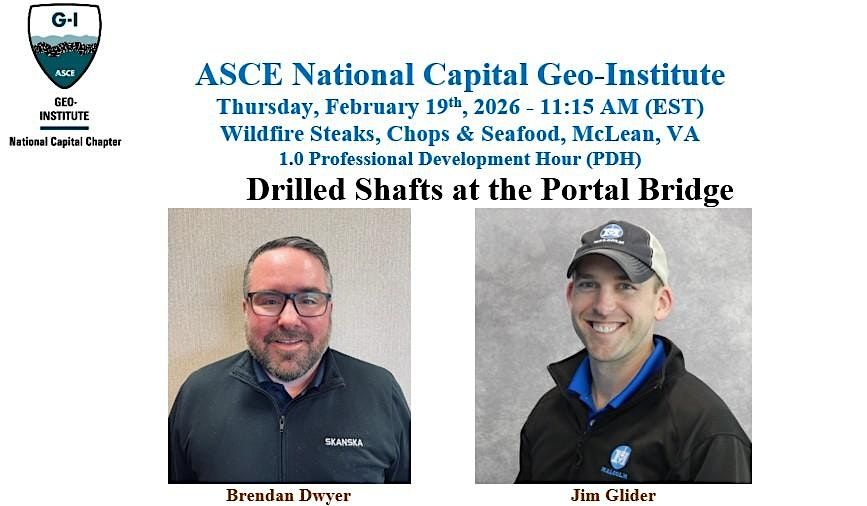 Welcome to Drilled Shafts at the Portal Bridge event! Join us on Thu. Feb. 19, 2026 at 11:15 AM at Wildfire Steaks, Chops & Seafood in Tysons to learn about the drilled shafts installed at the new Portal North Bridge and the challenges faced during the planning and construction of drilled shafts. Don't miss out on this opportunity to network with industry professionals and experts in the field. See you there!