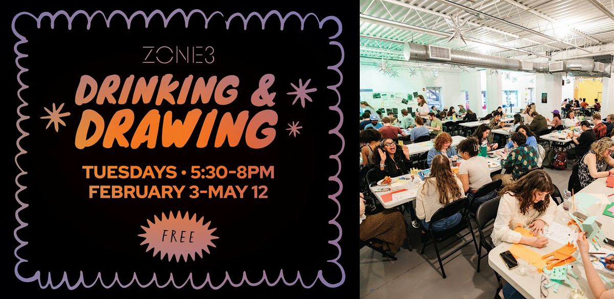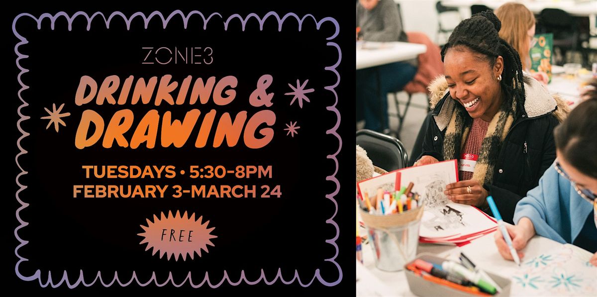 Join us Tuesday evenings this winter for Drinking + Drawing — a free weekly gathering where creativity, community, and casual fun come together. Hosted by Zone 3, this long-running series is led by a local artist each week, sharing prompts, inspiration, and their creative process in a relaxed, welcoming environment.