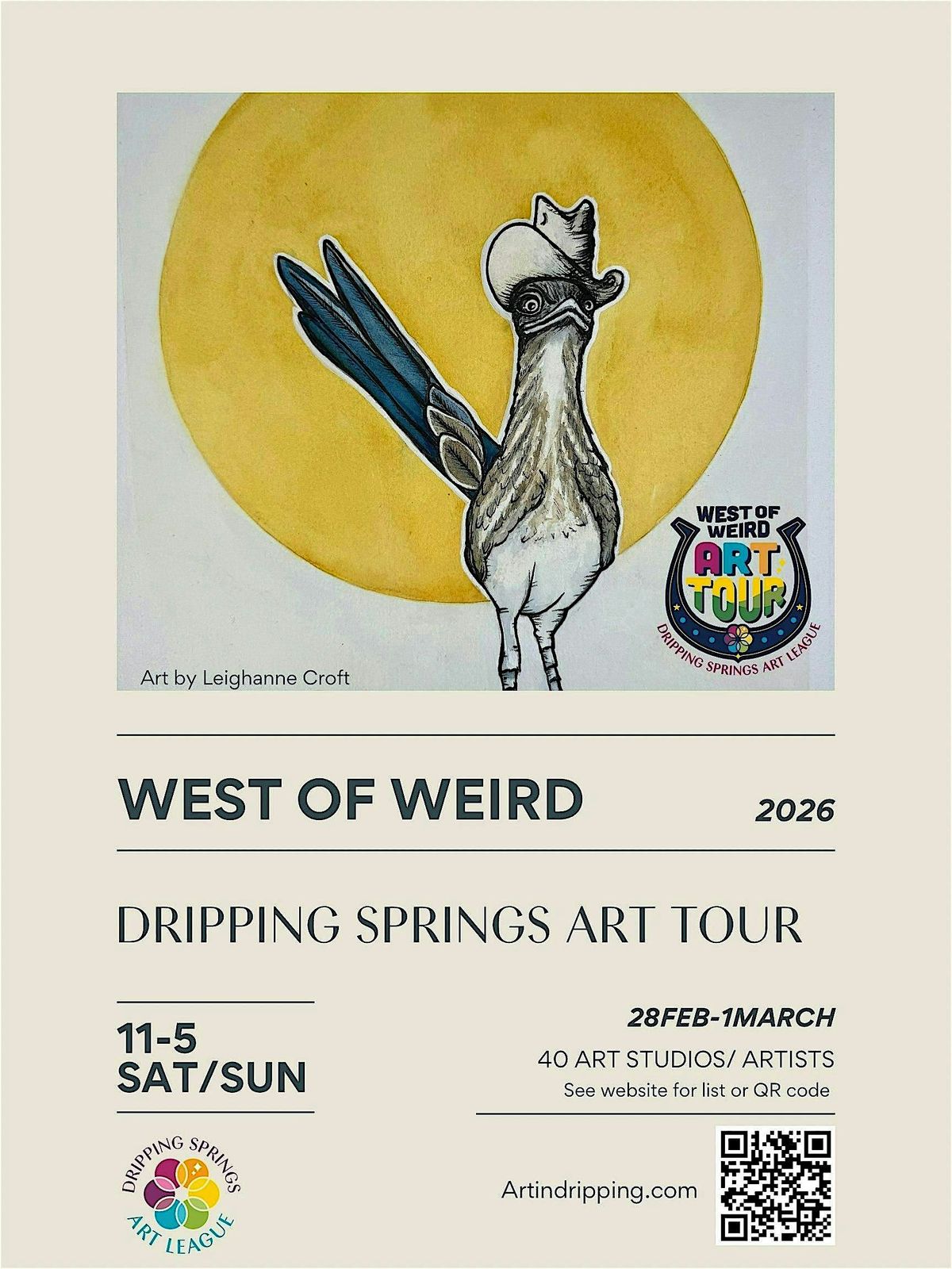Get ready for an awesome in-person art experience! The DRIPPING SPRINGS ART TOUR - WEST OF WEIRD is your chance to explore incredible local art, meet creative minds, and soak up some seriously cool vibes. Whether you’re an art lover or just looking for a fun day out, this event has you covered. Don’t miss out on discovering unique pieces and the hill country spirit that makes this tour one-of-a-kind!