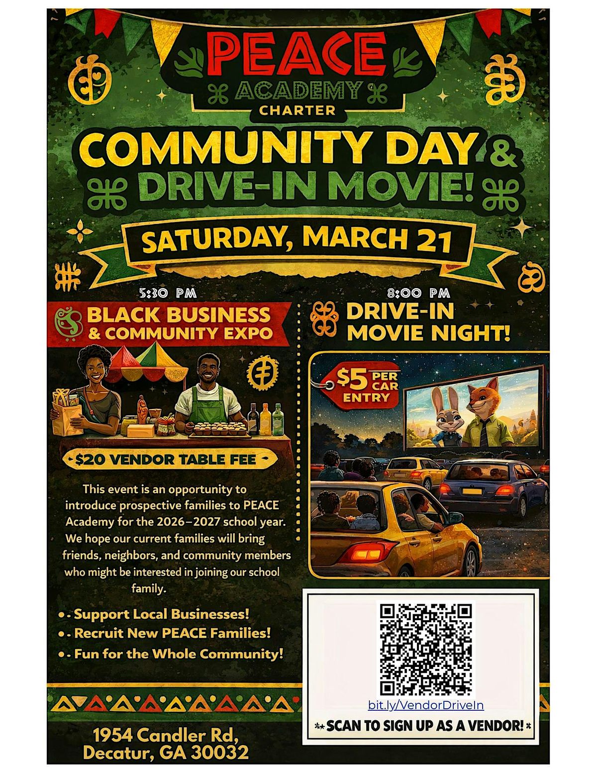 You're invited to PEACE Academy's Annual Drive-In Movie night on March 21, 2026, paired with a Black Business and Community Expo. Bring the family, support local vendors, and enjoy a movie under the stars. Just $5 per car. New families receive free admission with registration. Vendors, sign up today at bit.ly/VendorDriveIn.