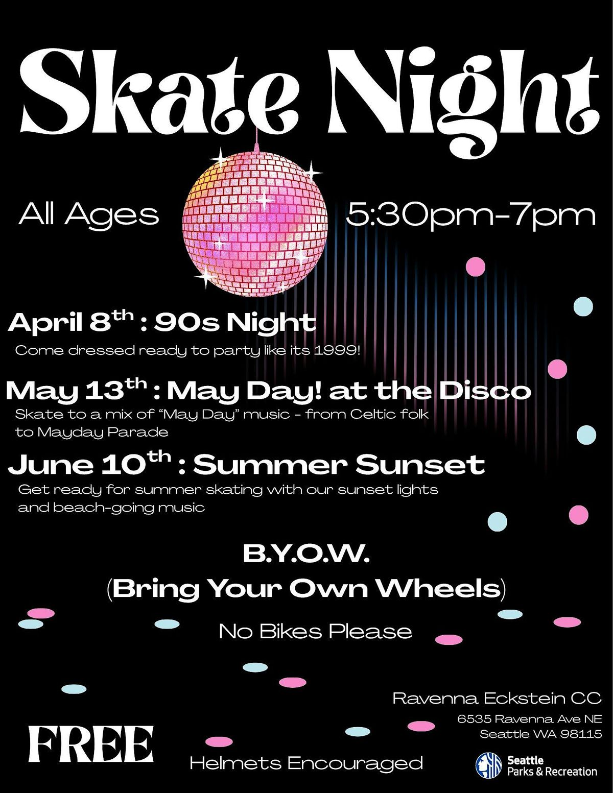 Free All Ages Skate Night with fun themes and disco lights! April 8th, May 13th, and June 10th at Ravenna Eckstein Community Center.About this Event