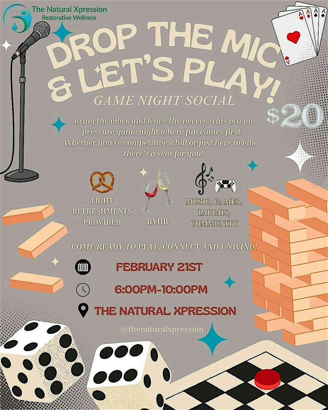 Get ready for a night full of fun and games! Drop The Mic & Let's Play is your chance to unwind, connect, and vibe with friends in person. Whether you’re a pro or just wanna have a blast, this event is all about good times and great company. So, bring your energy, your laughs, and get ready to play! Don't miss out on this awesome hangout!
