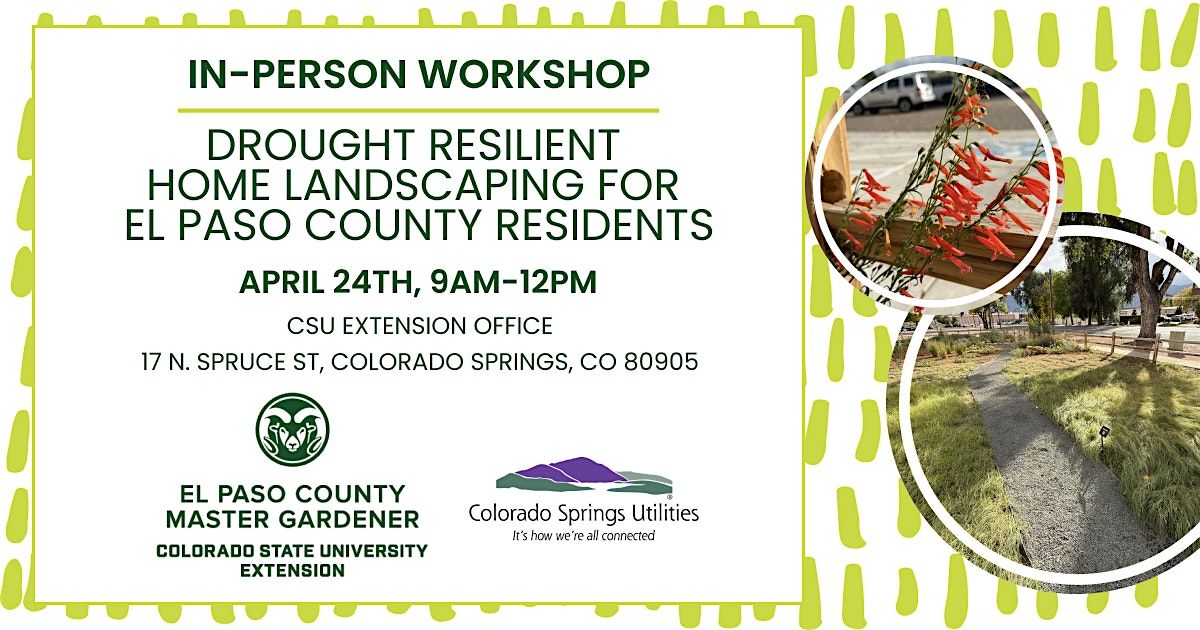 This half-day workshop will include a water supply outlook (Scott Winter, Colorado Springs Utilities), ideas for incorporating native grasses into your landscape (Catherine Moravec, Colorado Springs Utilities), drought-ready landscaping principles (Lisa Pace, Colorado Springs Utilities), and a native plant demonstration garden tour (Allisa Zurbuchen, Colorado State University).