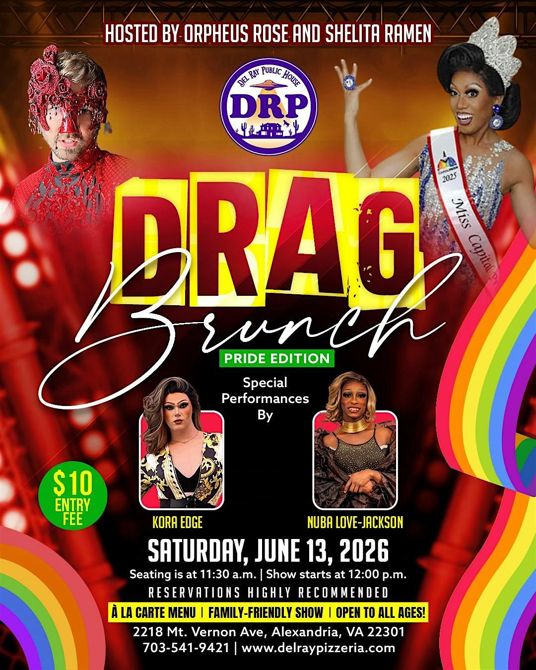 Celebrate Pride Month with a spectacular DRP Drag Brunch – Pride Edition at Del Ray Public House! Hosted by the fabulous Orpheus Rose and Shelita Ramen, this special edition brunch brings together incredible drag entertainment, delicious food, and an inclusive celebration of love, pride, and community.