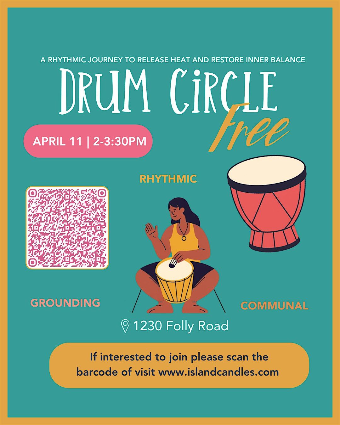Come join us for an awesome in-person drum circle at Island Candles, led by Shoshanna Richek. Whether you’re a pro or just wanna have fun banging on drums, everyone’s welcome. If the weather is nice, we’ll be outside soaking up the rays; if charleston gives us her stormy side, we will be drumming it up inside our studio. Instruments will be provided, but feel free to bring your own too!