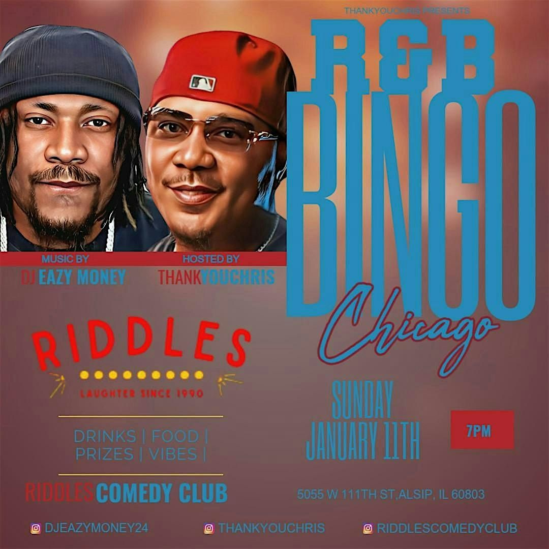 Welcome to TRAP Vs. R&B BiNGO CHICAGO! Get ready for a fun-filled afternoon at Riddles Comedy Club on JANUARY 11TH, 2026 at 7:00 PM.