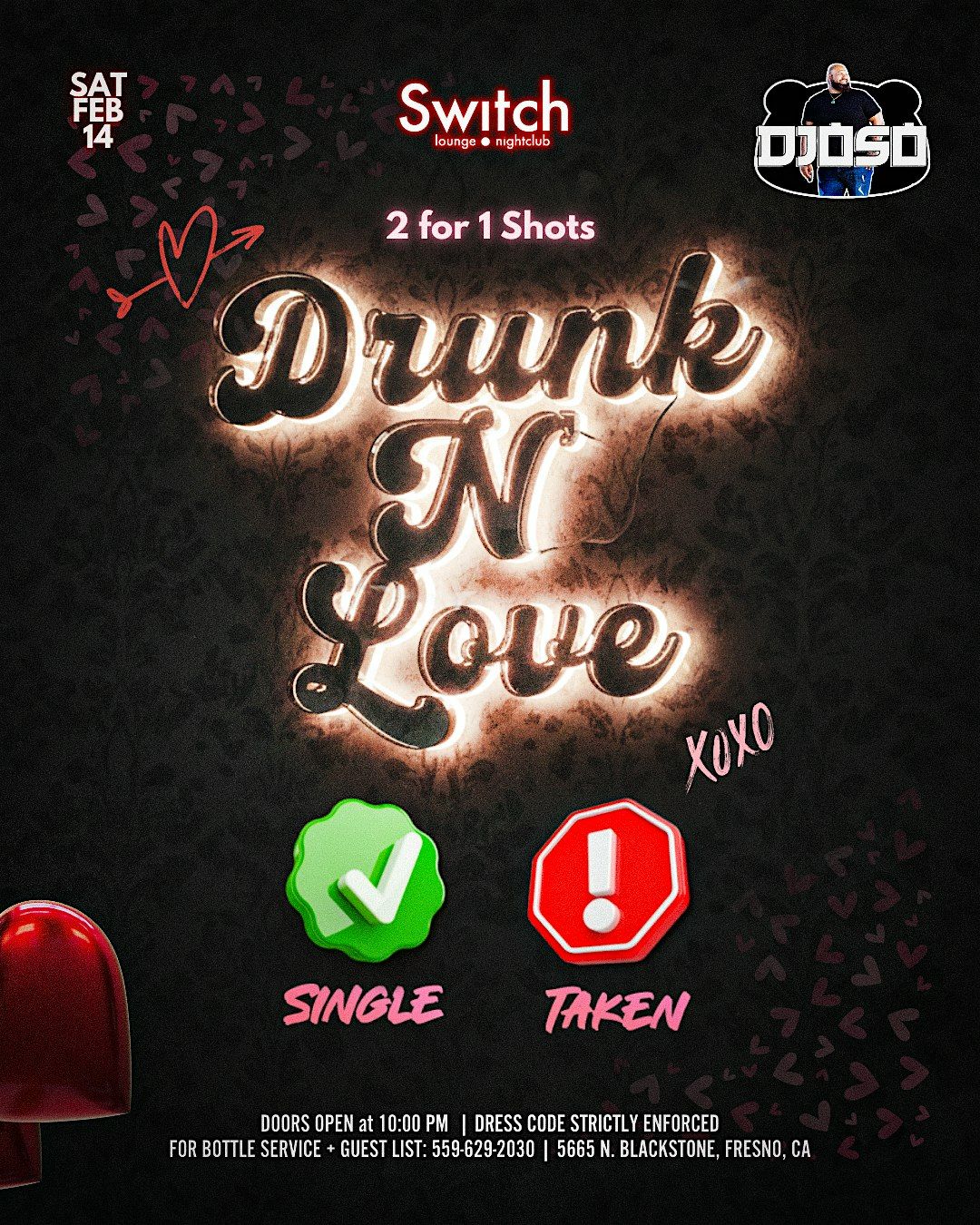 Get ready for an epic night out at Drunk N Love! Show up and play the game: Green = Single & Red = Taken. It's the perfect way to meet new people or just have fun with your crew. Plus, enjoy 2 for 1 shots ALL NIGHT – yup, you read that right!