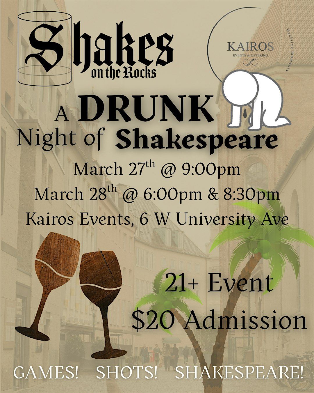 Games – Shots – Shakespeare! Two nights only in Gainesville, Florida. Dreamstealer Productions and Kairos Events are bringing drunk Shakespeare shows back in style with Shakes on the Rocks: A Drunk Night of Shakespeare.