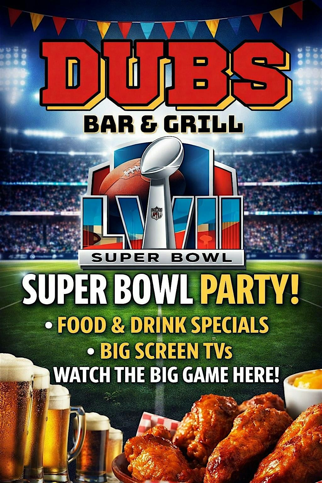 Join us for Superbowl LX at Dubs Bar & Grill. Tickets include: wing bar, nacho bar and dessert bar. Drinks available for purchase.