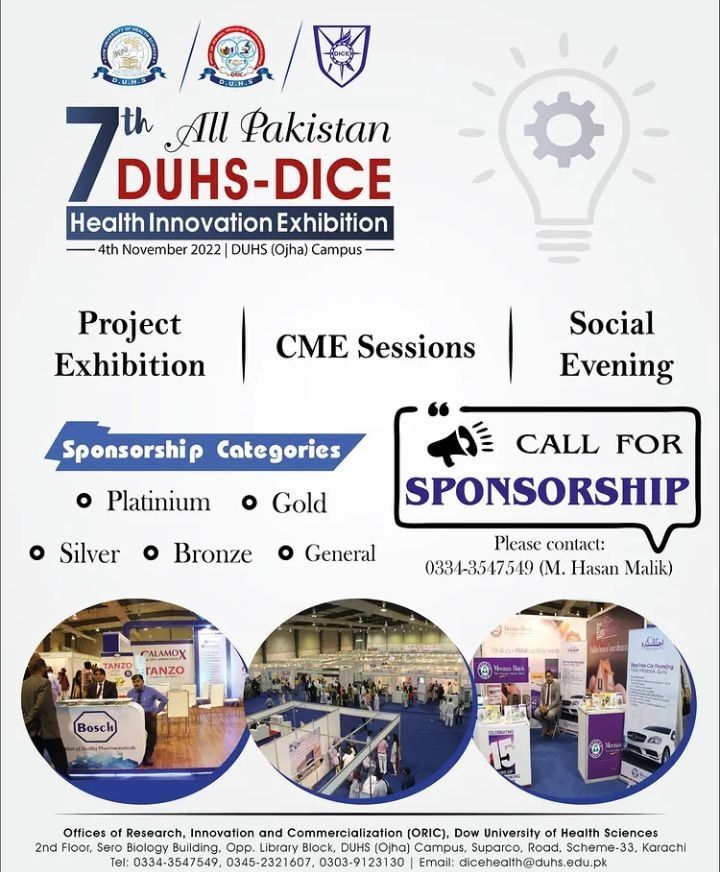 7th ALL PAKISTAN DUHS – DICE HEALTH INNOVATION EXHIBITION 2022 on November 2022Dow University of Health Sciences in collaboration with Distinguished Innovations, Collaboration & Entrepreneurship - DICE Foundation is going to organize The 7th All Pakistan DUHS – DICE Health Innovation Exhibition 2022 on 4th November 2022. This distinguished and unique event will provide a platform to our youth and the entrepreneurs to share their innovative projects and ideas .