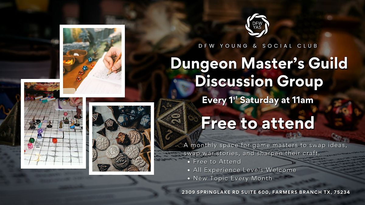 Led by DFW Young & Social's house DM Andrew, each session centers on a specific topic and opens the floor for discussion, shared experiences, and practical takeaways. Whether you're a seasoned DM or just starting to run your first campaign, you'll leave with something useful.