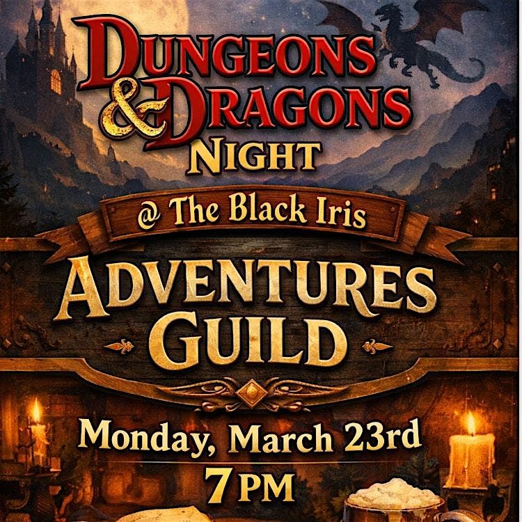 The Black Iris Adventure Guild will gather once a month for an evening of imagination, strategy, and fellowship around the table. Whether you’re a seasoned adventurer or brand new to Dungeons & Dragons, this event welcomes players of all experience levels to step into a world of quests, monsters, and legendary storytelling. Guided by experienced Dungeon Masters, small parties will explore epic adventures while enjoying the unique atmosphere of Black Iris Social Club.