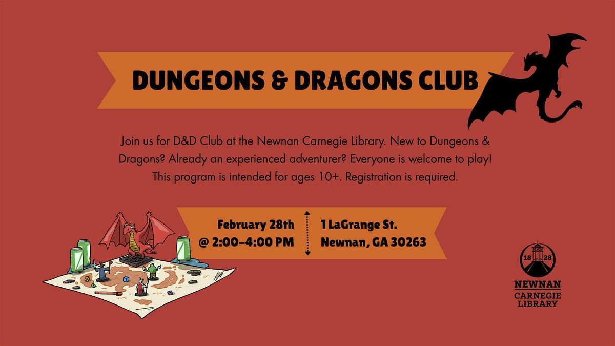 Join us for D&D Club at the Newnan Carnegie Library. New to Dungeons & Dragons? Already an experienced adventurer? Everyone is welcome to play!