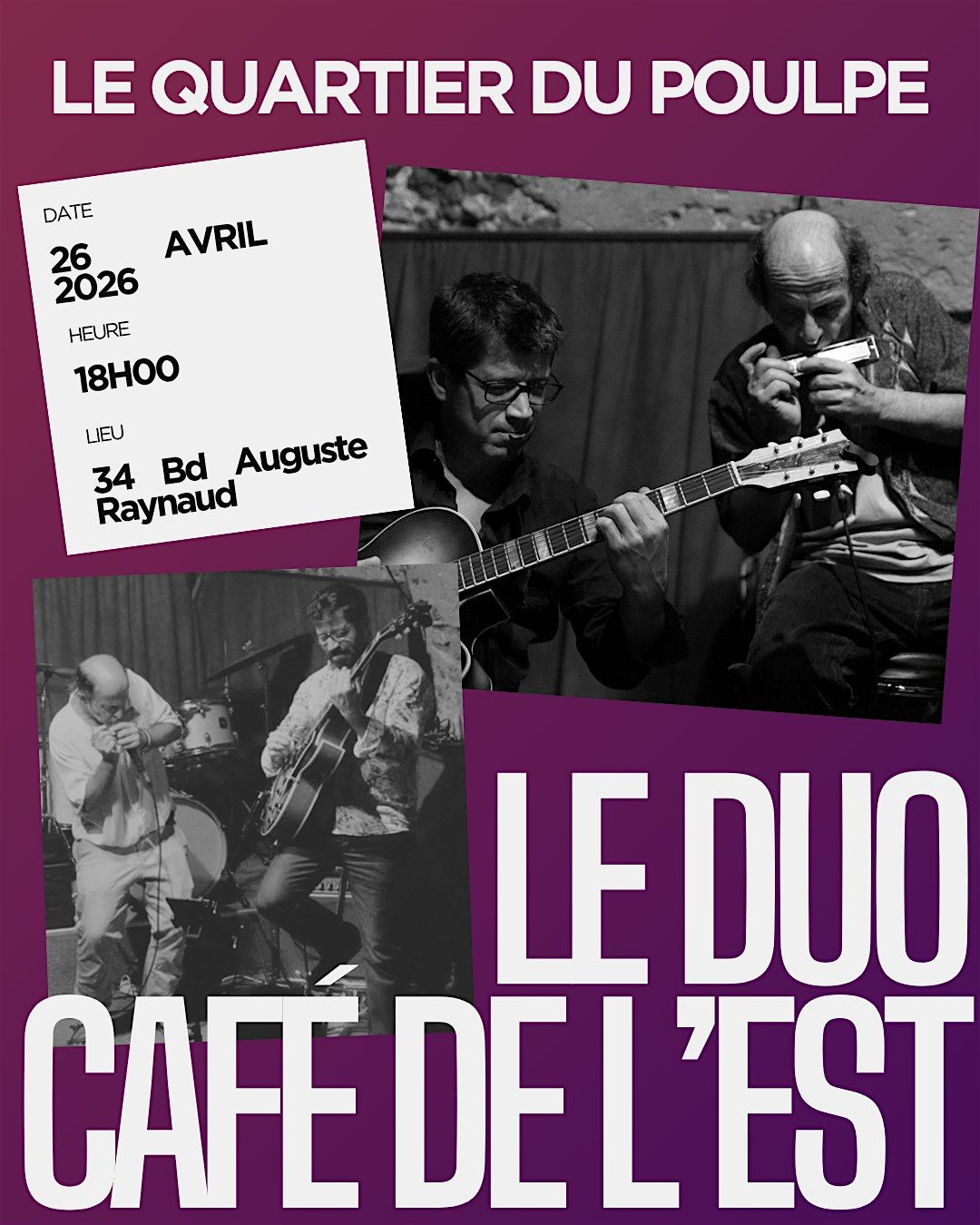 Le dimanche 10 Mai, Le Quartier du Poulpe troque son habituel tumulte pour une soirée placée sous le signe de l'élégance et de la complicité musicale. Nous avons le plaisir d'accueillir Le Duo Café de l'Est, une formation née d'une rencontre évidente en 2016 entre deux passionnés : Patrick et Jean-Marc.