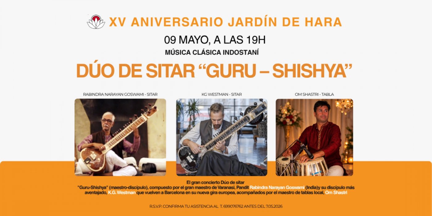 El gran concierto Dúo de sitar "Guru-Shishya" ( maestro-discípulo), compuesto por el gran maestro de Varanasi, Pandit Rabindra Narayan Goswami (India)y su discípulo más aventajado, K.G. Westman que vuelven a Barcelona en su nueva gira europea, acompañados por el maestro de tablas local, Om Shastri @om_shastri.