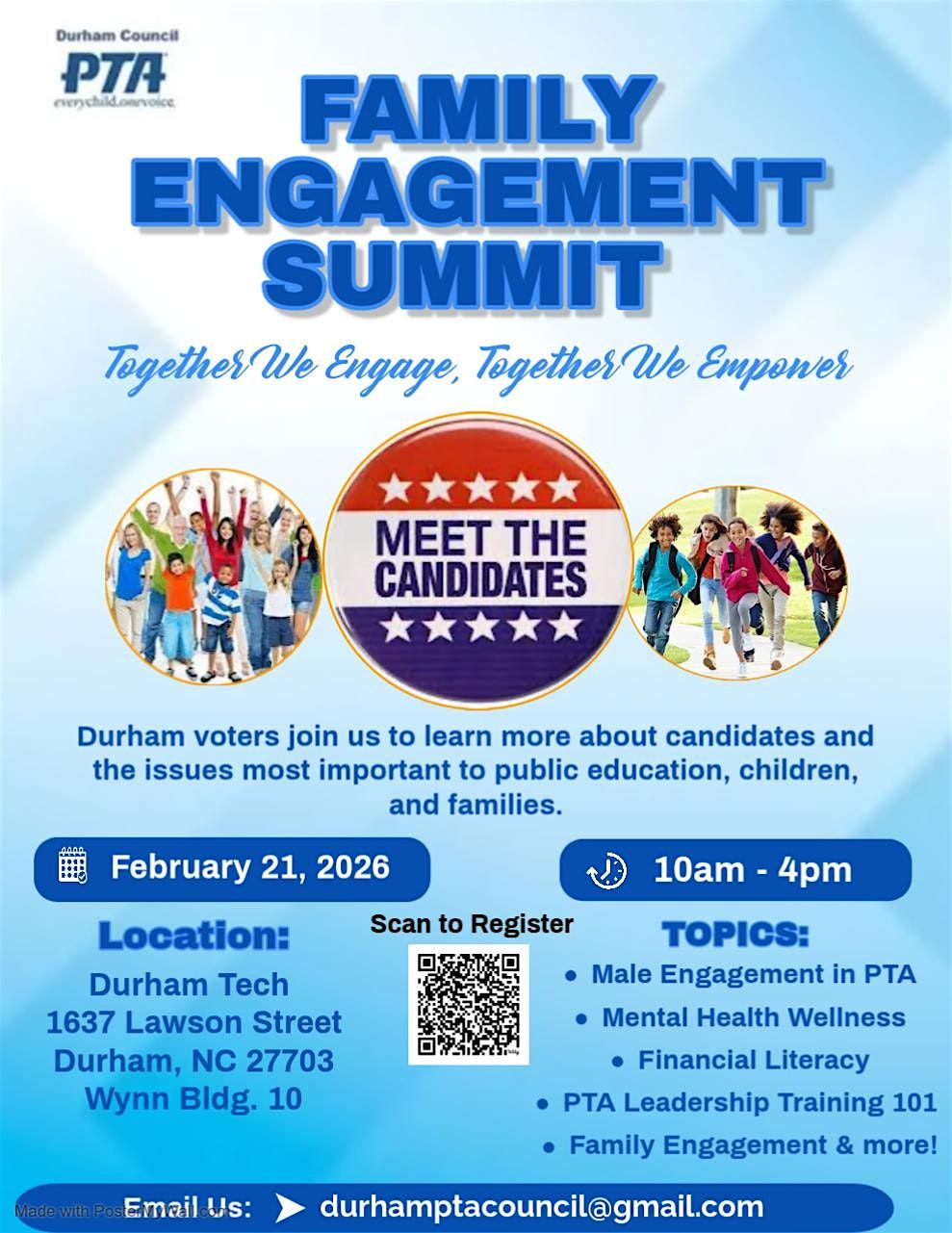 Join the Durham Council of PTAs for our Annual Family Engagement Summit on Saturday, February 21, 2026, at Durham Technical College, Wynn Bldg. 10, 1637 Lawson St, Durham from 10:00am - 4:00pm.
