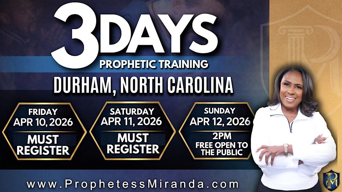 Come experience a powerful Prophetic Training Weekend with Prophetess Miranda in Durham, North Carolina. This prophetic school was established to equip, train, and mature believers in biblical truth while cultivating an atmosphere for healing and deliverance, and a deeper walk with God!