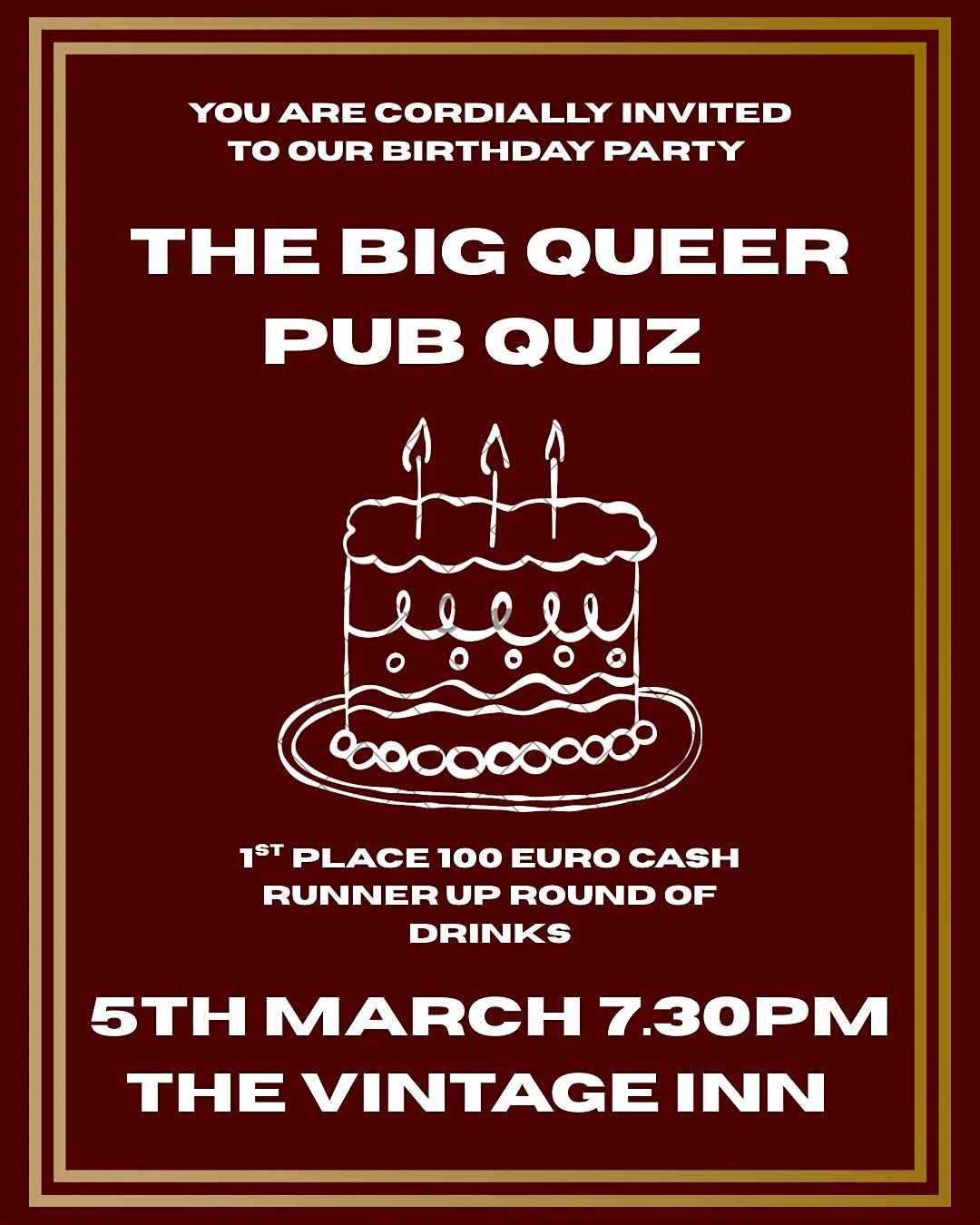 We're having a birthday party, and YOU ARE INVITED! After one year of DYKEish events and theatre, we are celebrating our very first birthday with the third edition of our BIG QUEER QUIZZES at the Vintage Inn! A pub quiz with pizzazz, come test your luck on rounds of pop culture, music, tv and film (and a special bonus round) with €100 CASH on offer for the winning team and a round of drinks for the runner ups! There might even be some birthday cake...