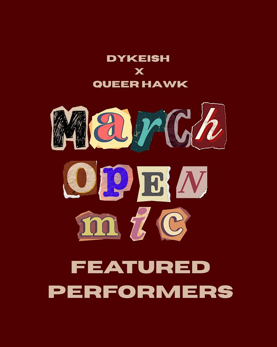Another month, another open mic! Queer Hawk is once against hosting us for a night full of queer creativity and community, featuring four wonderful featured performers: