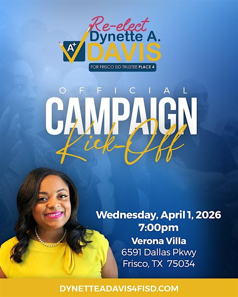 Frisco ISD Community!You are invited to attend the campaign kickoff of Dynette A. Davis 4 Frisco ISD Board of Trustees Place #4.