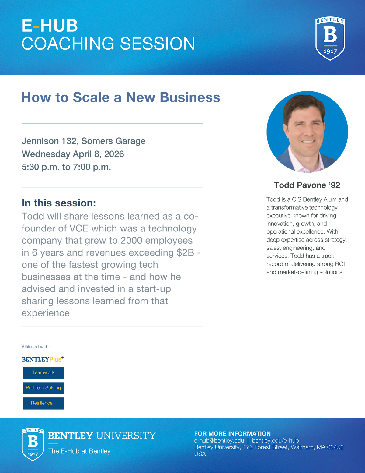 Todd will share lessons learned as a co-founder of VCE which was a technology company that grew to 2000 employees in 6 years and revenues exceeding $2B - one of the fastest growing tech businesses at the time - and how he advised and invested in a start-up sharing lessons learned from that experience