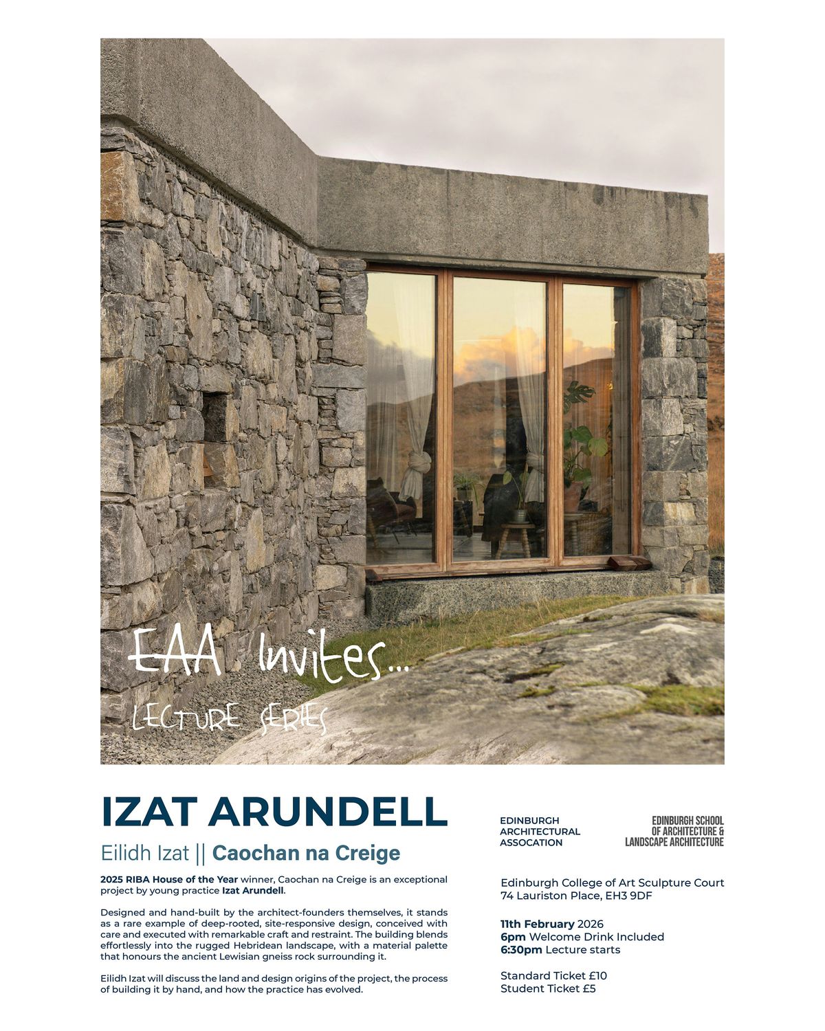 For the second in our EAA Invites.. series, we're delighted to be welcoming Eilidh Izat, Director of Izat Arundell, an architectural practice based in the Outer Hebrides. Eilidh will give a unique insight into their exceptional project Caochan na Creige, which won the 2025 RIBA House of the Year award.