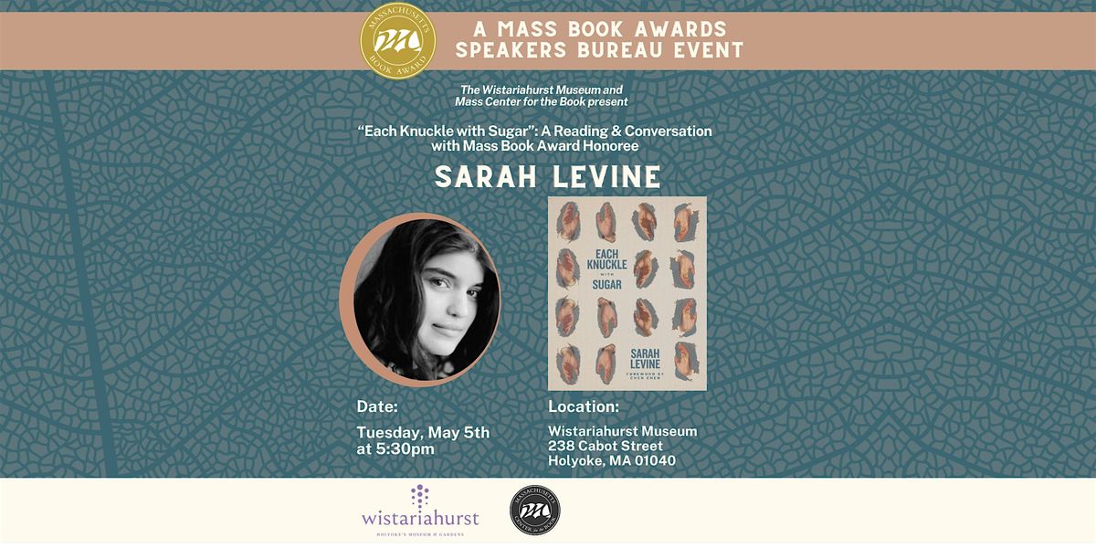 Join Wistariahurst Museum for an evening with poet Sarah Levine, whose collection Each Knuckle with Sugar received Poetry Honors in the Massachusetts Book Awards. This program will feature a reading from the collection, followed by a conversation with the poet and an audience Q&A. Attendees are invited to engage with the poems and hear Levine speak about her creative process, influences, and the questions that shape her work.