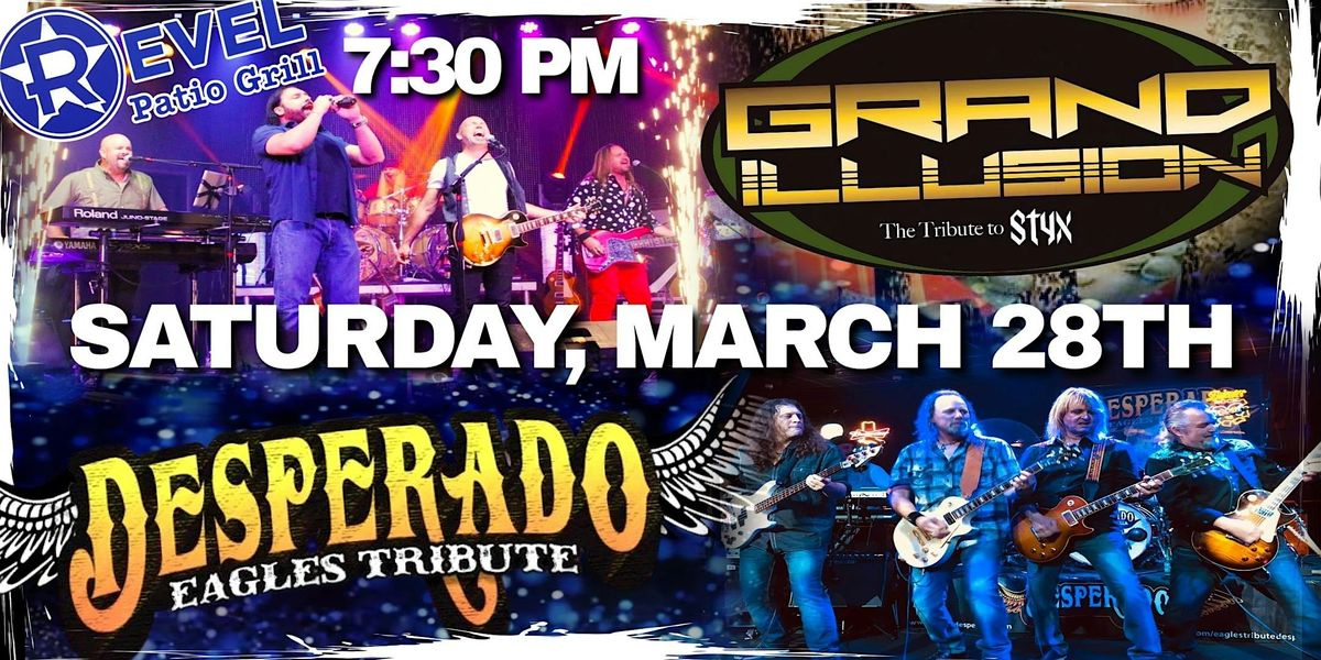 Get ready to have your mind blown at The Revel! Weβre bringing you a massive double-feature with Desperado (The Ultimate Eagles Tribute) and Grand Illusion (The Electrifying STYX Tribute)! πΈπ€