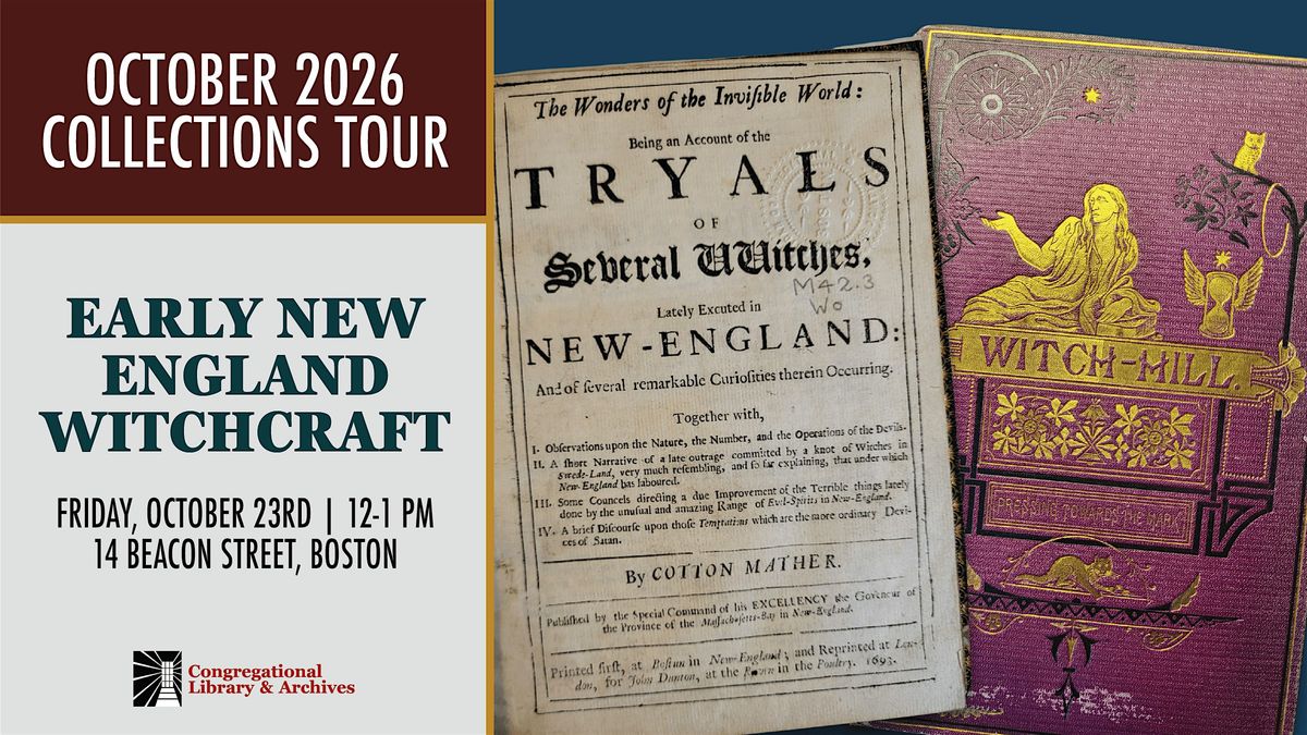Get into a spooky season mood by viewing rare books and manuscripts from the Congregational Library & Archives' collections, including seventeenth-century works on ghosts and witchcraft, books connected to the Salem witch trials, sermons about witchcraft, and Cotton Mather’s diary. The tour will also consider why this subject continues to fascinate us today.