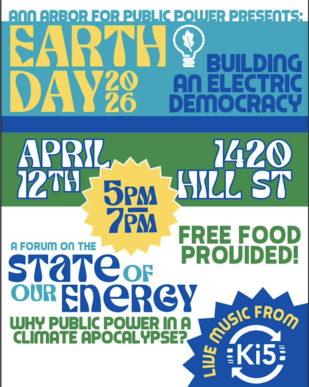 Ann Arbor for Public Power hosts a neighborhood forum and party around the question: Why Public Power in a Climate Apocalypse? Music by Ki5About this Event