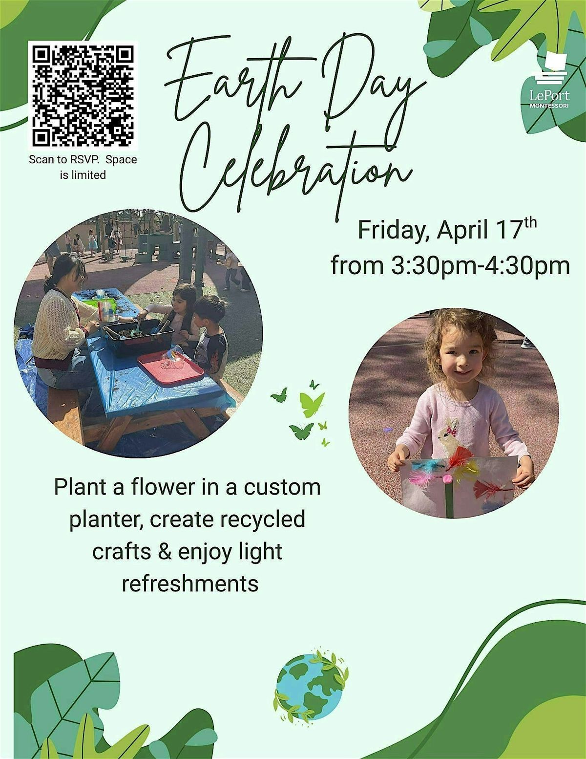 Join us for a FREE event in celebration of Earth Day. Plant a flower in a planter, create crafts, and enjoy light refreshments. This event is suitable for children between the ages 2-6 years old and up to 2 adults are welcome to attend.