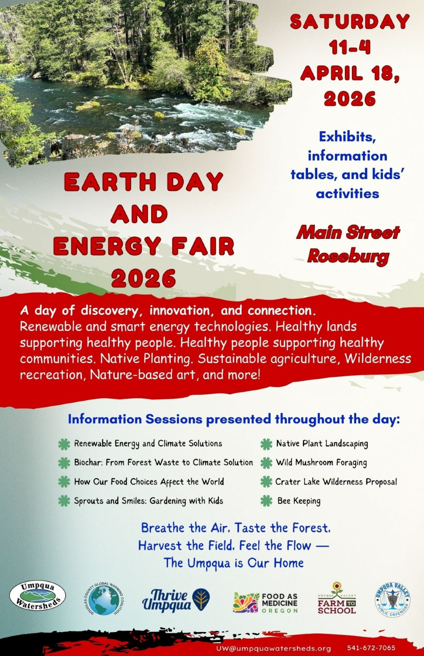 A day of discovery, innovation and connection. Experience renewable and smart energy technologies. Learn how healthy lands support healthy people, and healthy people support healthy communities. Explore sustainable agriculture, wilderness recreation, nature-based art, the bounty of the Umpqua, and more!