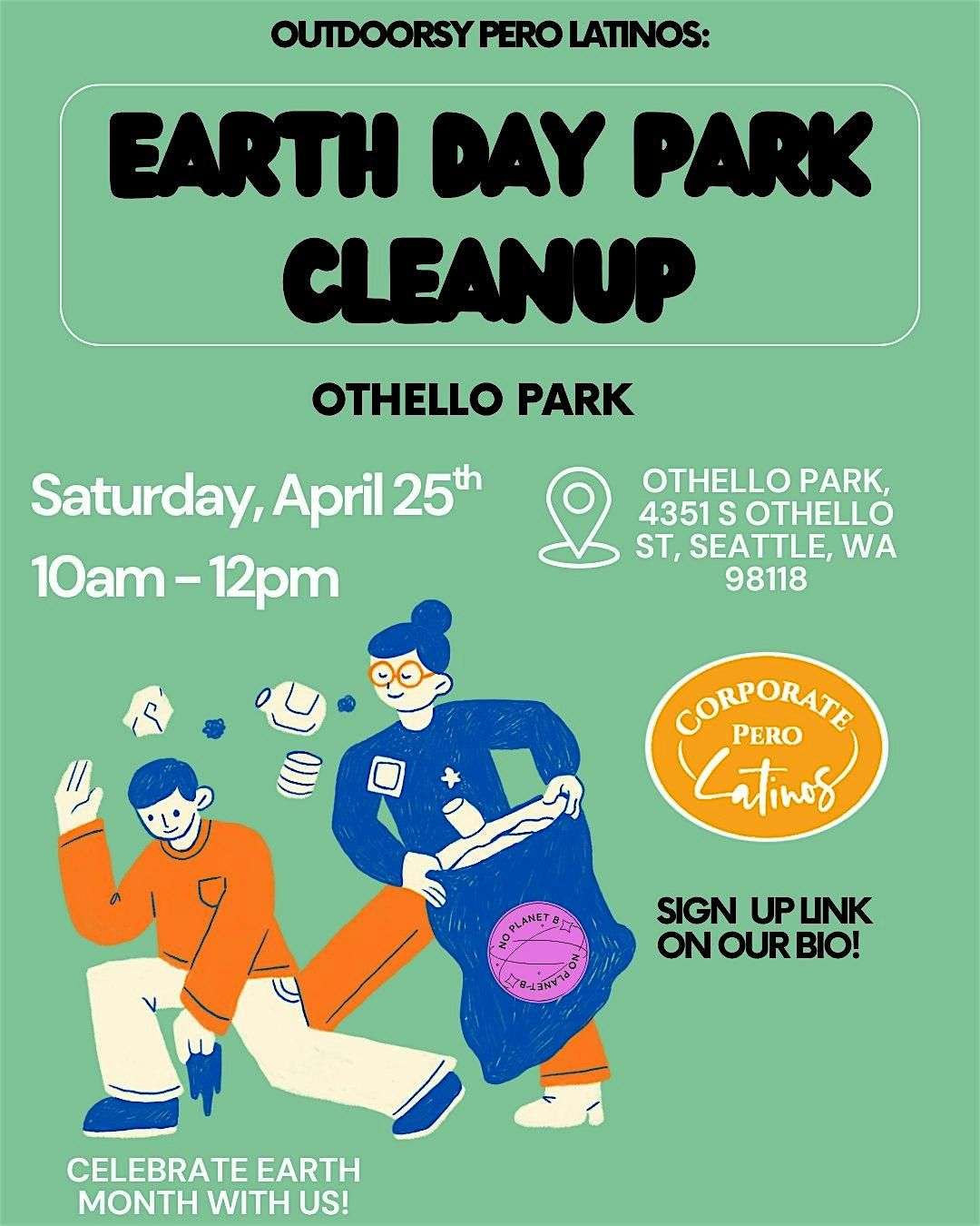 Share your love for Mother Earth and join Corporate Pero Latinos for an Earth Month Cleanup on Othello Park/Playground! Friends, family, and furry friends are all welcome!