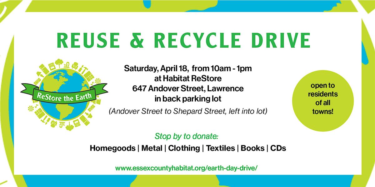 Stop by the Earth Day ReUse & ReCycle Drive on Saturday, April 18, from 10am - 1pm in the back parking lot of the Habitat ReStore at 647 Andover Street, Lawrence. (Andover Street to Shepard Street, left into lot)