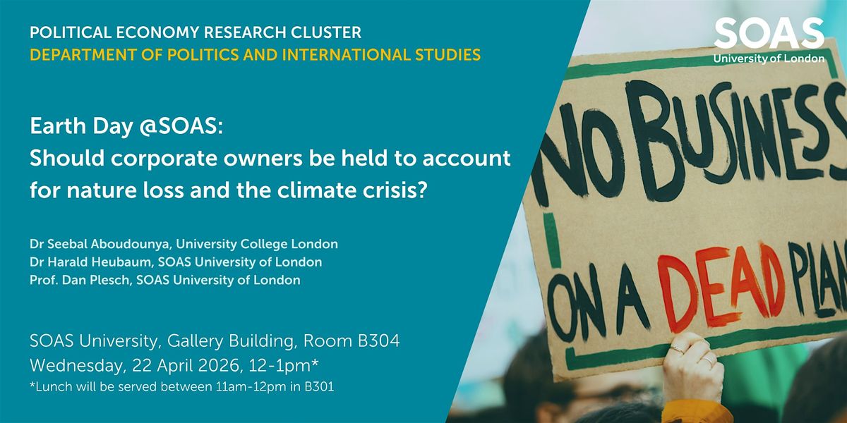 Join us on 22 April 2026 for a change-focused Earth Day @SOAS, where we will introduce a new policy research project within the Political Economy Research Cluster (PERC) of the Department of Politics and International Studies, inviting new partnerships, social media and policy research initiatives. Our main target: is restoring firm’s legal accountability and liability for climate damages.